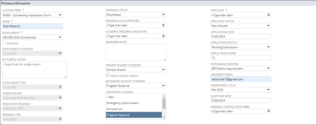 The Primary Information section within the Scholarship Application form gathers essential data for creating a scholarship application in the associated fields.