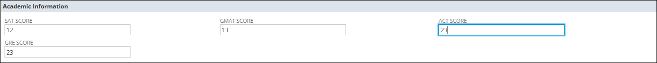 The Academic Information section within the Scholarship Application form gathers information about the applicant's test scores, such as SAT, GRE, GMAT, and ACT, used to assess the applicant's academic qualifications for scholarships.