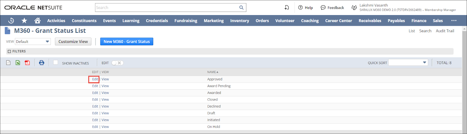 > Scholarships > Setup > Grant Status> M360 - Grant Status List page and click Edit in the row of the grant status you wish to modify,