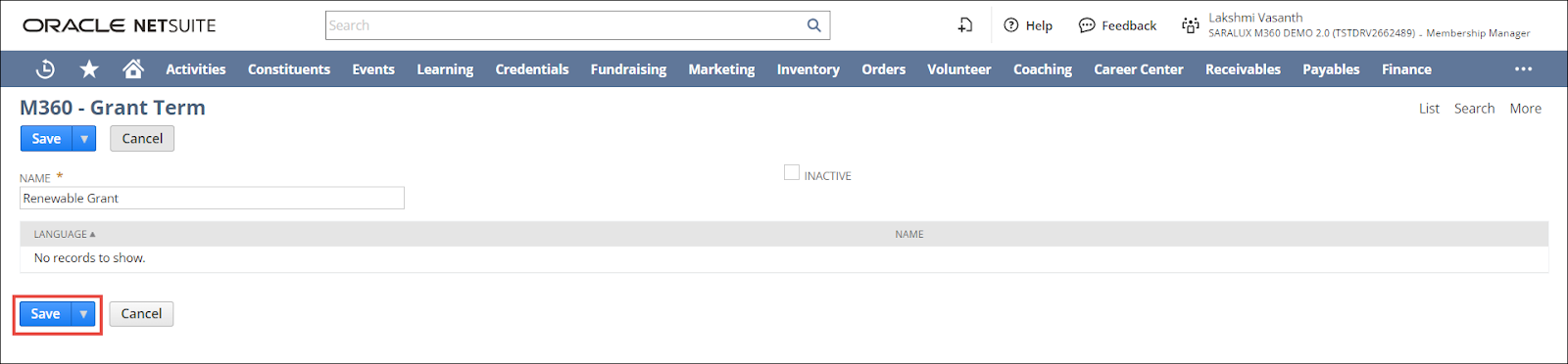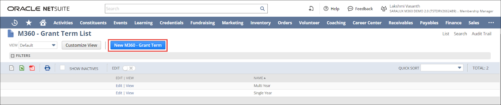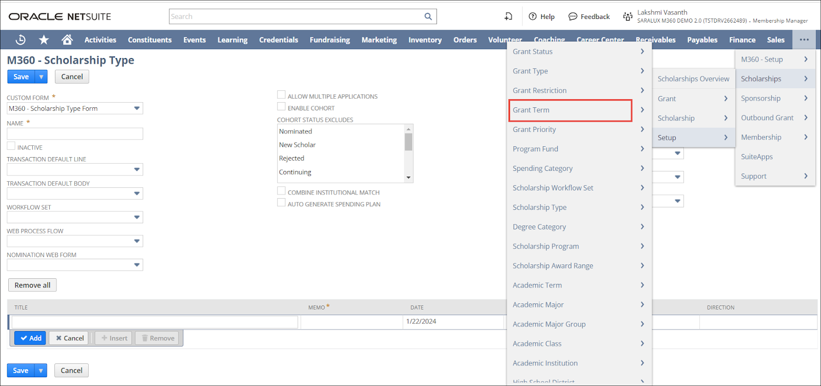 The grant term enables you to determine the period within which the allocated funds have to be utilized.  You can add a new grant term if it does not exist in the M360 - Grant Term List.