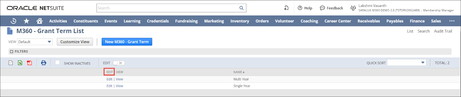 > Scholarships > Setup > Grant Term > M360 - Grant Term List page and click Edit in the row of the term you wish to modify,