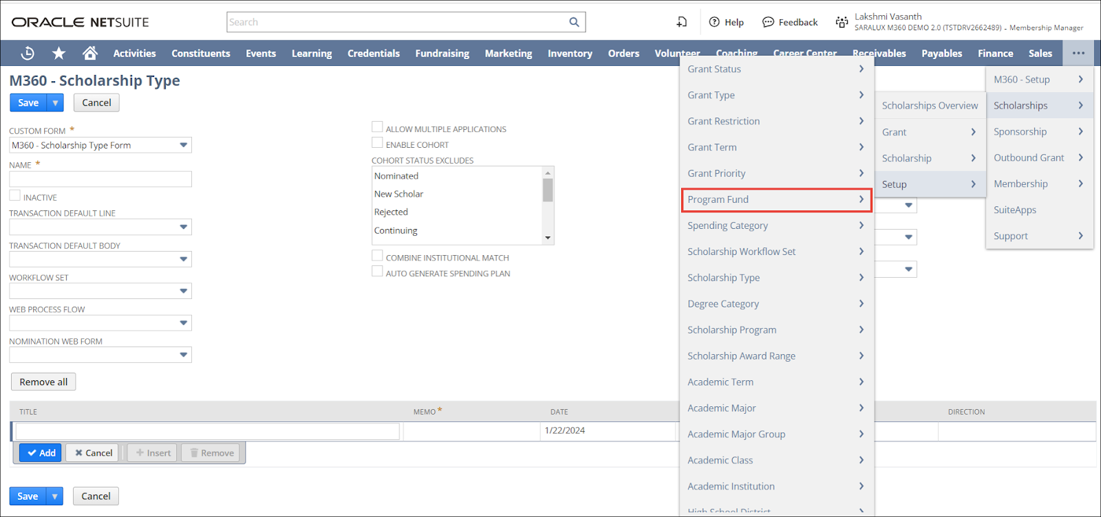 > Scholarships > Setup > and click Program Fund.