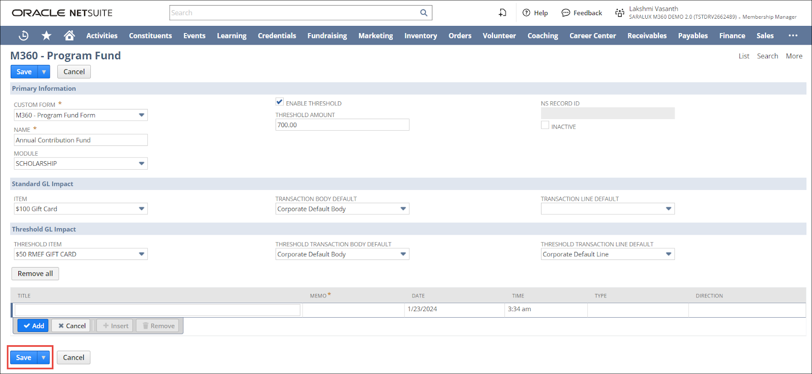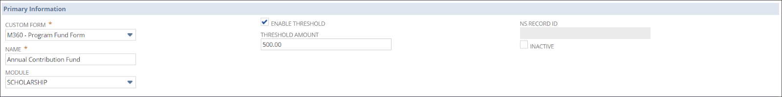 The Threshold GL Impact enables you to select NetSuite items that relate to the threshold of the associated program fund.
