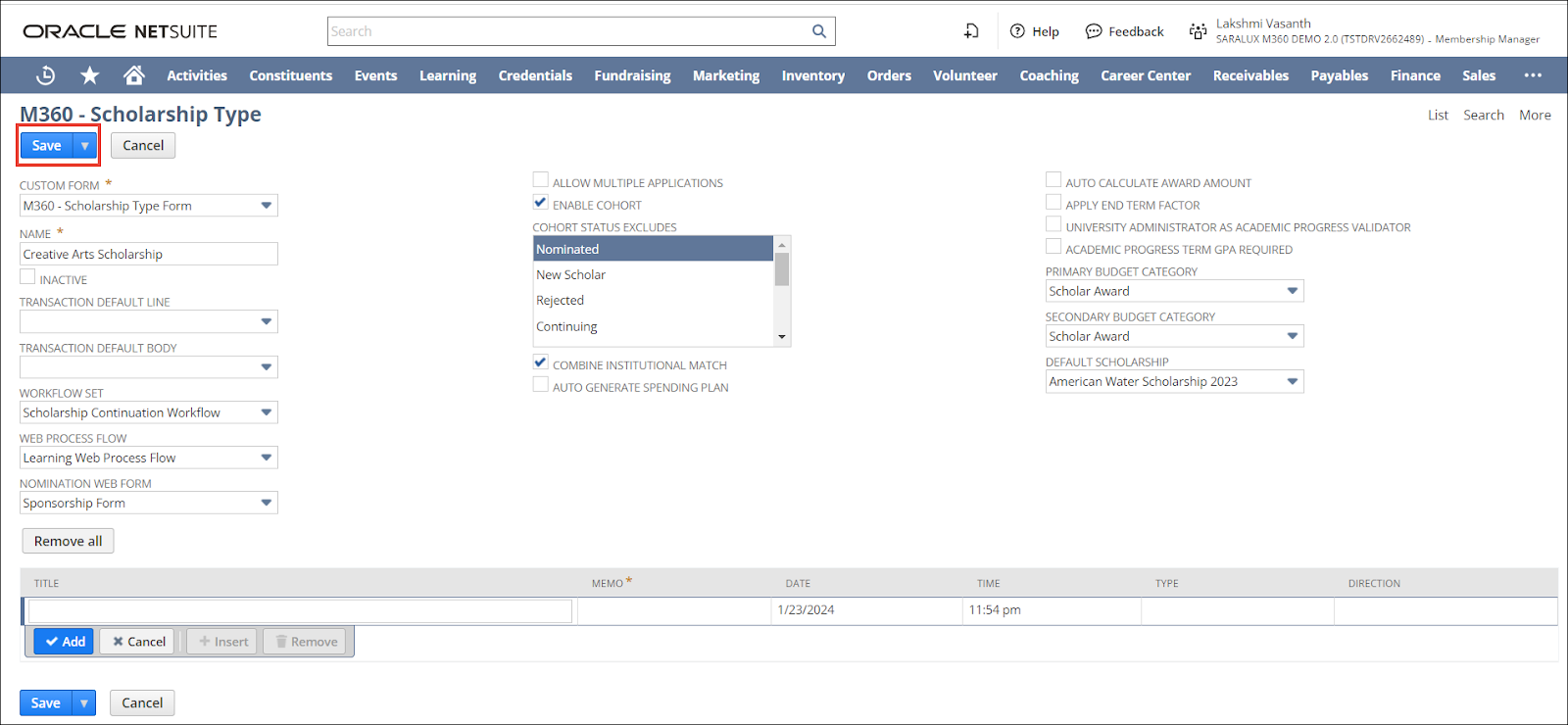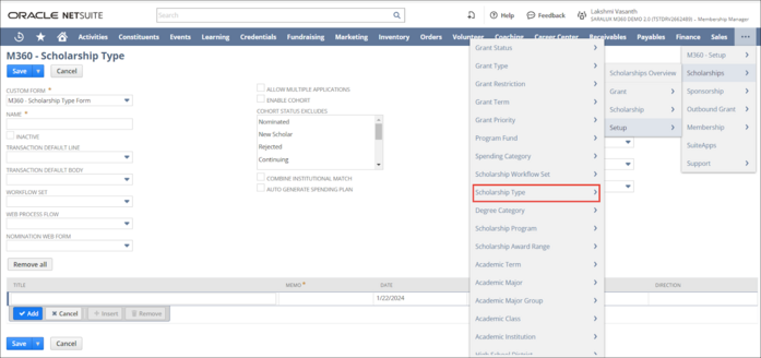 The Scholarship Type section allows the configuration of various scholarship categorizations based on similar criteria or eligibility.  You can create a scholarship type.