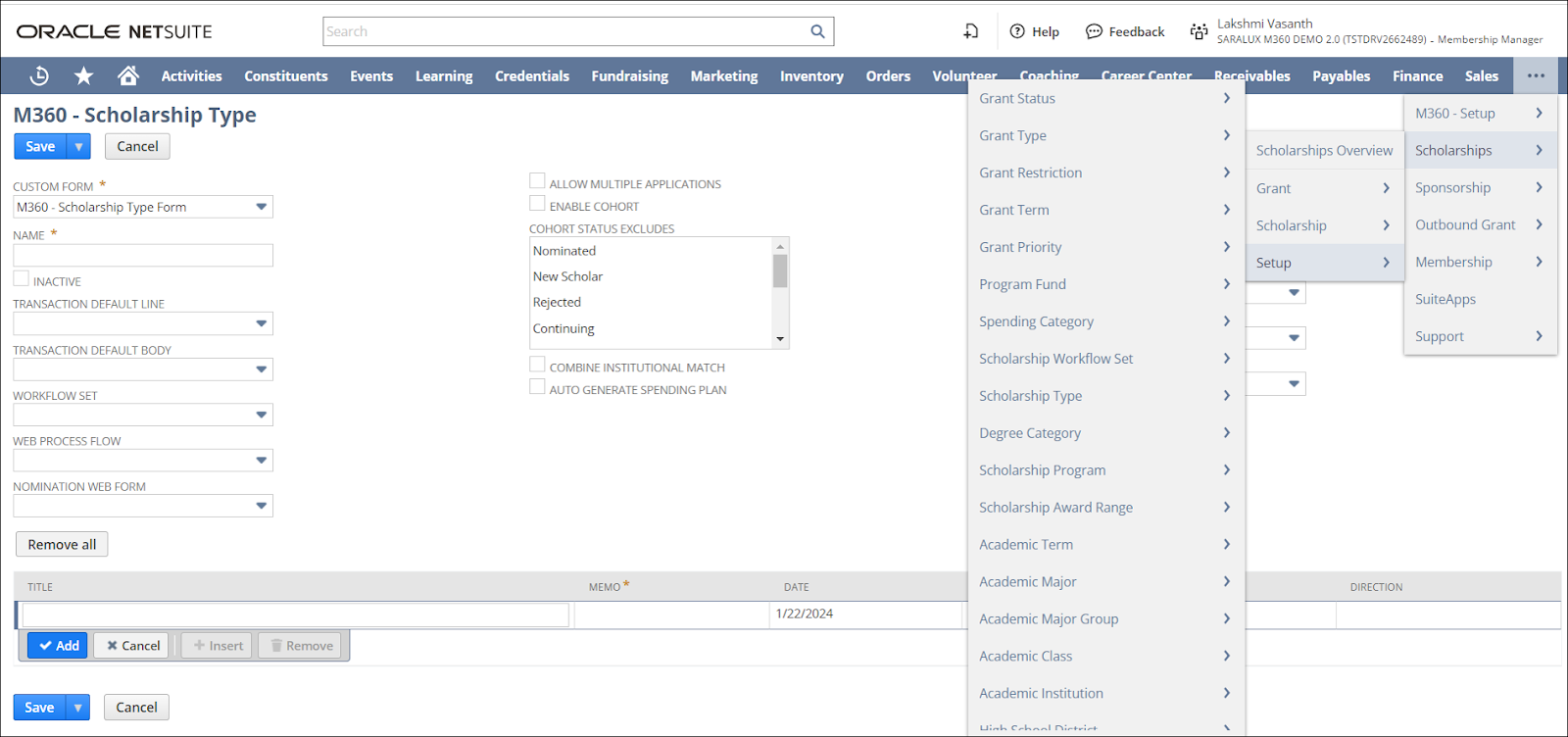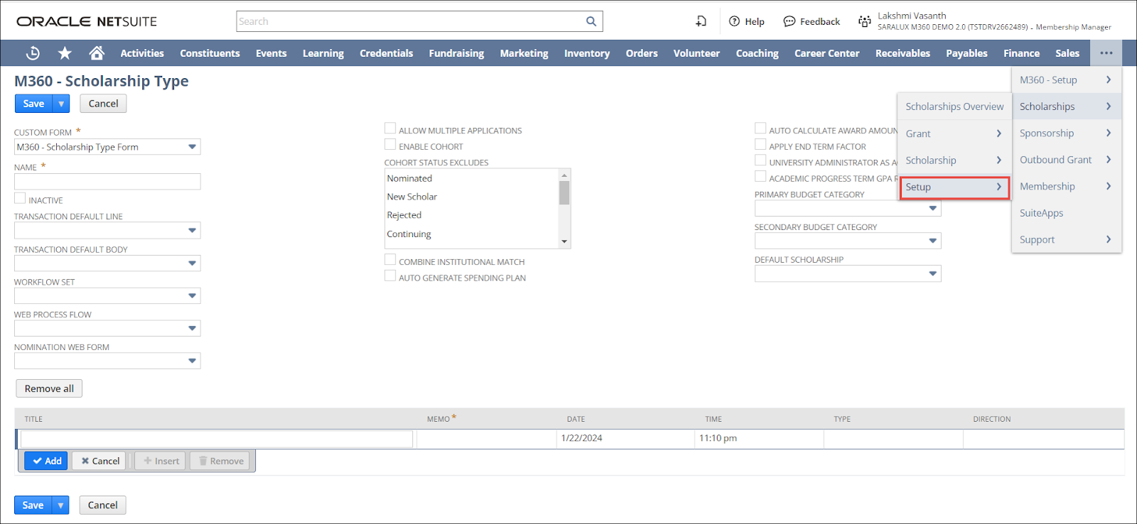 The Scholarship - Setup section allows you to configure various components essential for the successful operation of the scholarship assignment and disbursement.