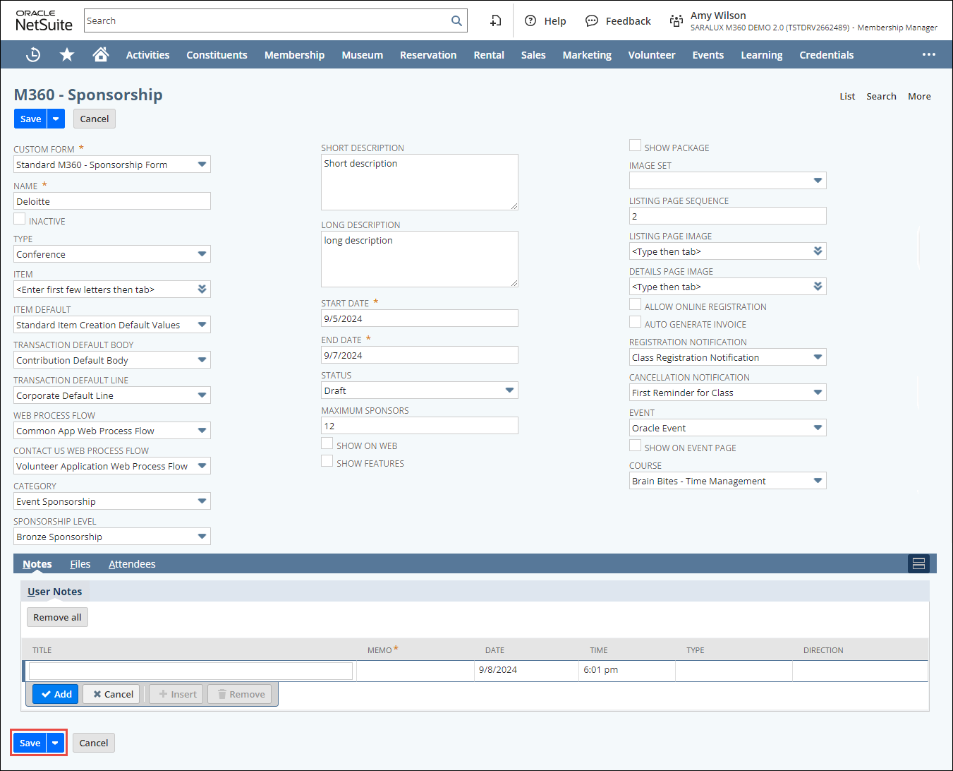 You can create a sponsorship to help secure financial or in-kind support for deserving candidates.