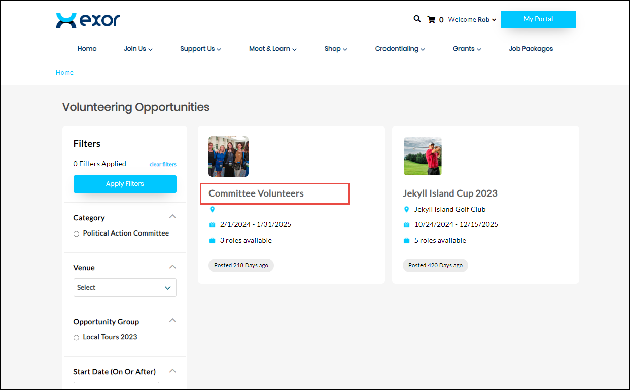 The Volunteering Opportunities page is displayed.