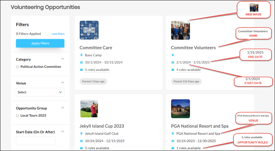 Illustration of Frontend Volunteer Opportunities’ Elements Configured at the Backend The following image shows a few of the elements configured at the backend for the Volunteers module.